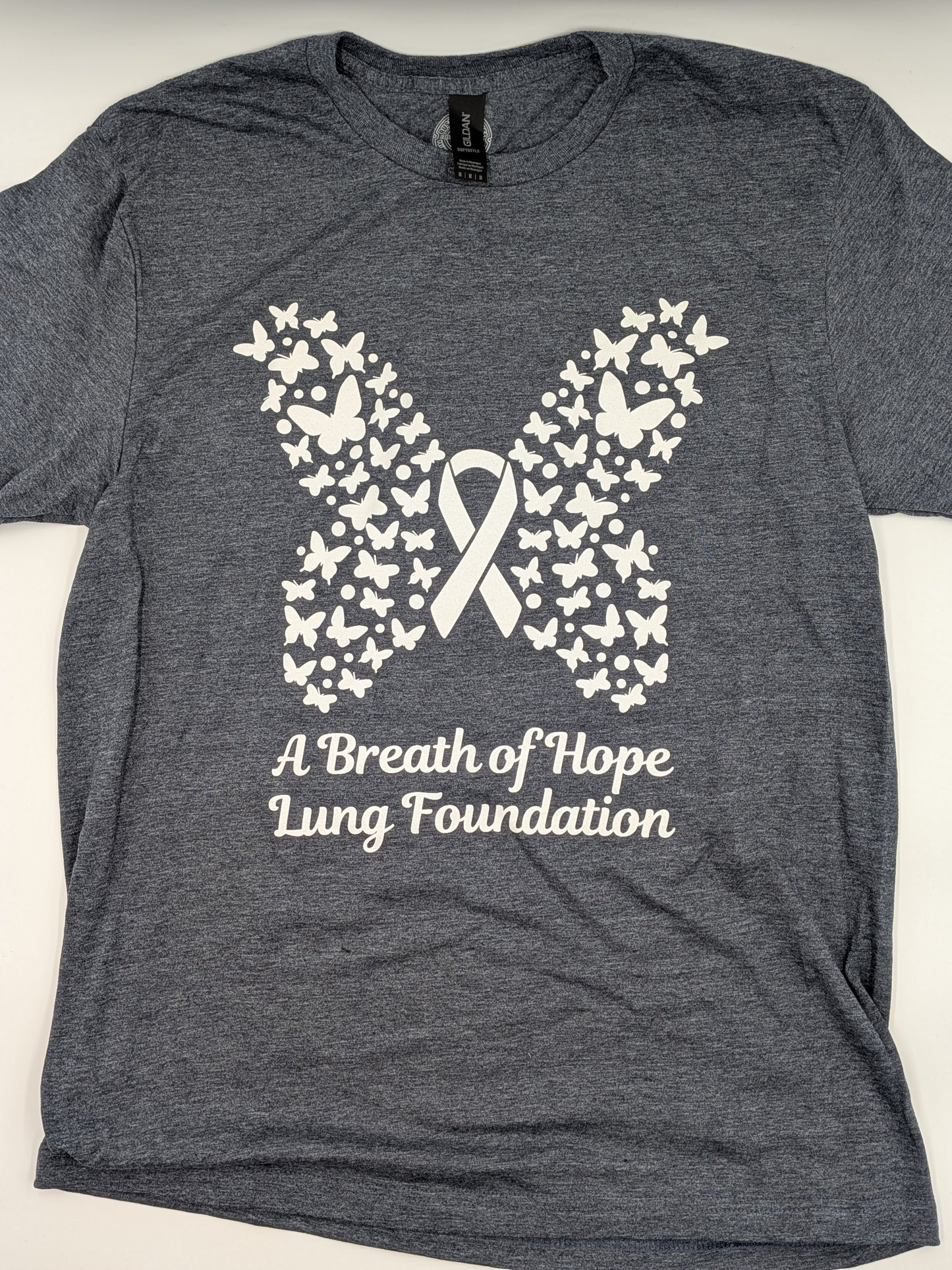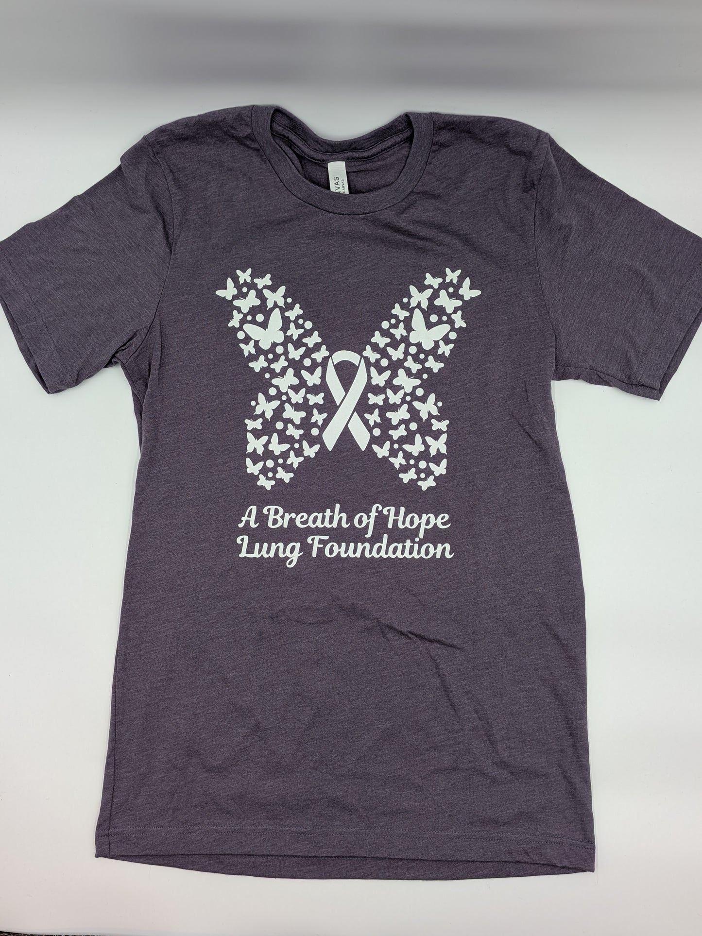 Show your support of lung cancer awareness with this new, summery, navy and white-ribbon butterfly t-shirt. It is super soft, made of a cotton/poly blend. Available in small, medium, large and extra large.